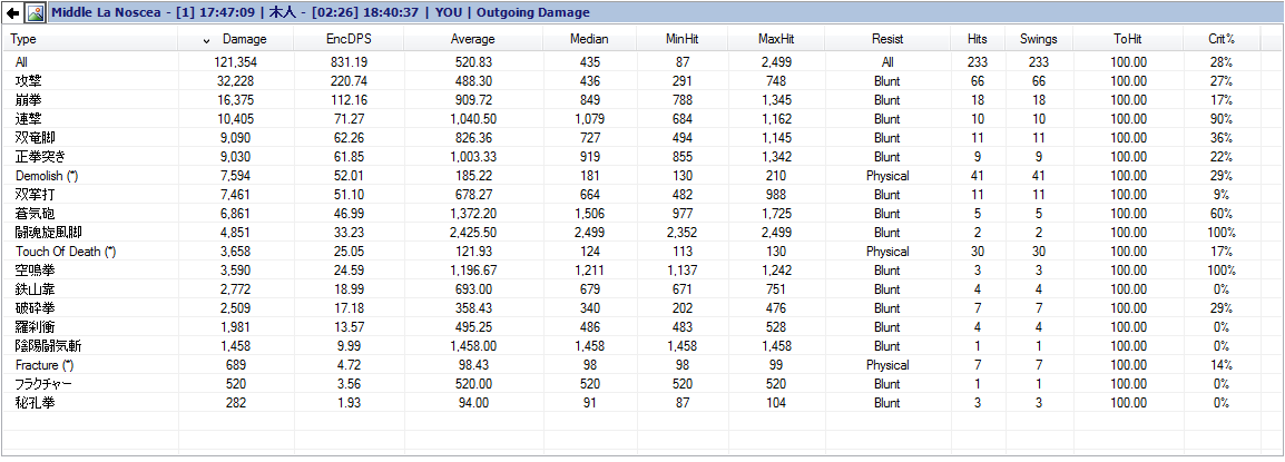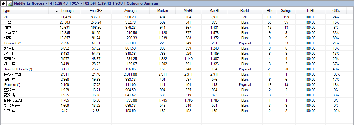 2015/06/22 Category : FF14(休) FF14 破砕拳ー双竜脚ー羅刹衝ー双掌打ー発勁+捨身ー崩拳ー踏鳴ー崩拳ー闘魂旋風脚ー崩拳ー鉄山靠ー崩拳ー空鳴拳ー破砕拳ー蒼気砲ー双竜脚ー陰陽闘気斬ー連撃ー双掌打ー秘孔拳ー崩拳アダマンジャダマルの装備IL143で2分間だとDPS823。クリティカル20%~28%でDPS790~830といったところ。陰陽闘気斬まで発勁、秘孔拳まで捨身のスキル回し。クリティカルダメージアップもあって高威力でいかにクリティカルを引けるかが重要。ステータスは意思260、クリ630、スキスピ550くらいだったはず。注意点は陰陽闘気斬は硬直が長いので踏鳴5回の双竜脚後に使うくらいか。よく見たら破砕拳のDoT回数が昔のままだ。実際はもう少しDPSは上がるみたい。破砕拳ー踏鳴ー崩拳ー崩拳ー捨身ー双竜脚ー発勁ー双掌打ー蒼気砲ー破砕拳ー陰陽闘気斬ー秘孔拳ー武器IL170に胴IL160で他は上と同じ。このスキル回しとあまりDPSに変化が無いような気がしてきた。アビリティの配置が妥協、迅雷リセットによるWSやAAの威力低下、迅雷Ⅰの状態が長い上に秘薬の挟む隙間も見当たらない。闘魂旋風脚スキル回しの何がいけないって、高威力の闘魂旋風脚にフルバフを合わせてるのにその最中に迅雷リセットがあること。闘魂旋風脚のあとに疾風迅雷Ⅲにしてからフルバフの選択肢もあるがさすがに遅すぎる。