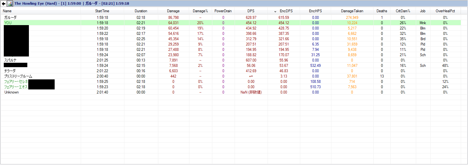 2014/09/19 Category : FF14(休) FF14 真ガルーダが最高効率すぎる。この2時間を必死に頑張れば25戦は最低やれるからこれだけで100は稼げる。2000ティンって考えると途方もないけど、これならかなり楽に感じられる。一番早いときで2分5秒、平均で大体2分30秒といったところ。高火力なりのスキル回しで多少戸惑ったけど慣れてきたかな。多分700くらいはたまったと思います。奇跡の480弱。1回目空鳴は羽にくらいの小細工はやってます。それ以外はいつも通りかなー迅雷維持の羽も無駄に攻撃してないし。あと連撃マンでもないしね。ただ450は頻繁にでるけど460以上はほぼ出ないし、モンク2のときは若干胡散臭い。