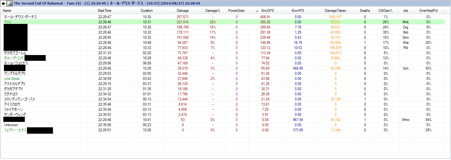 2014/08/28 Category : FF14(休) FF14 P1 北固定、岩外内P2 外ゴーレム開始、外周ラン、内ゴーレム開始P3 ゴースト1、天地~ノヴァ張り付きP4 チャリオット~ノヴァの間 迅雷維持のため1回攻撃エオスなのもあってこのへんが限界じゃないかな。360以上出すとなるとセレネにしてチャリオットノヴァ中張り付いて攻撃は必要。そもそも俺の固定はセレネを使うことがないのでどのくらい伸びるのかも不明。次はサブ竜でモンクにどれくらい近づけるかだけど、まだ300すら超えてないんだよな…昨日の感じだと最後までノーミスなら300は超えたと思うけど。