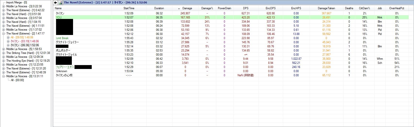 2014/09/06 Category : FF14(休) FF14 間違って昨日の消しちゃったけど、極タイタンで黒はかなりむずいなーDPS290(詩なし)までは出せたけど全然安定しない。装備は100武器に命中のついてない神話アラガンみたいな感じ。実際は新式90だけど命中いれてるだけなので違いはほぼない。スキル回しミスってMP空、薬品使ったことないよで詰みみたいな状況も何度か…さすがに当たり前のようにエーテル持参するようにはなったかな。現状いいところ平均250出てるかなーってくらいしょぼい黒です。詠唱確定の見極めprocや迅速魔の使い方タイタンジャンプ後のはいりかたジェイル~大激震のスキル回しジェイラーのスキル回し(範囲)このあたりが特に重要。ここがしっかりできれば300は出せそうだけどノーミスでなかなかいけない。いつもどこかでミスるし、近接では考えられないくらい谷底に落ちてるし。とりあえず、もっと黒で色々な状況に慣れないと扱いきれそうもないな。ほんとモンク以外やると難しくてきつい。