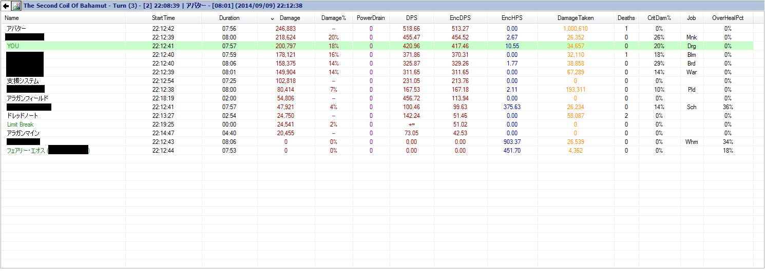 2014/09/07 Category : FF14(休) FF14 最近エラー多いな…無駄に長文書いてるときに限ってエラーがでる。さすがに2度も長文書くつもりはないので簡潔に。色々書いてたんだけど、まぁ300超えましたって話。雑魚黒卒業して真ん中くらいに足踏みいれた感じですね。IL110武器になったし当然といえば当然だけど、全然安定はしていない。木人では3分や6分測定で平均DPS360ってところだけど思ったより弱い気がするな。武器はよくても防具が弱いし、アクセもIL80が混じってる分影響が大きいのかも。命中も490オーバーで、侵攻編でも470あればいいから過剰すぎるよね。