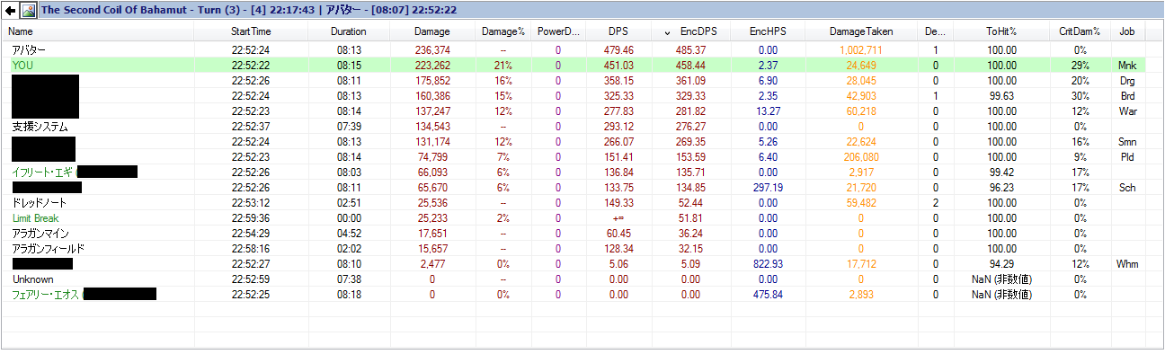 2014/06/04 Category : FF14(休) FF14 1層 DPS390捕食対象になったので回避すべくバルブに入ろうとしたら、バルブがなくてそのまま捕食される。PT全体の火力が上がっててLBがたまったのは敵の体力数ミリでした。戦闘時間4分55秒、はじめてスレイヤー防具がでる。2層はじめてペトリくらった…視線外してからの攻撃するまでが早すぎた。気合使ったあとだったので、どうすることもできずDPS330しかでず。3層開幕踏鳴のときに秘孔とフラク1回ずつ。最後にTPが余裕だったのでフラク1回と秘薬2回。戦記IL110でエオスでも最後までTP問題がなければいい感じにDPSが出ますね。もう少しでDPS460ってところ。召喚もDPS400以上でかなり強い。PT全体DPSもかなりいい感じに上がってますね。4層先週末にボス残り10%切るくらいまで進みました。DPS300はいけそうだけど召喚には負けそう。今週末の練習でクリアまでいけるかも。この装備(IL103)で1層DPS400(捕食なし)、2層400(叫声なし)、3層450なら動けてる。あくまで俺の固定での話だけど。1層にしても2層にしてもDPSを必死に出す動きはしてないからもっといくだろうけど。