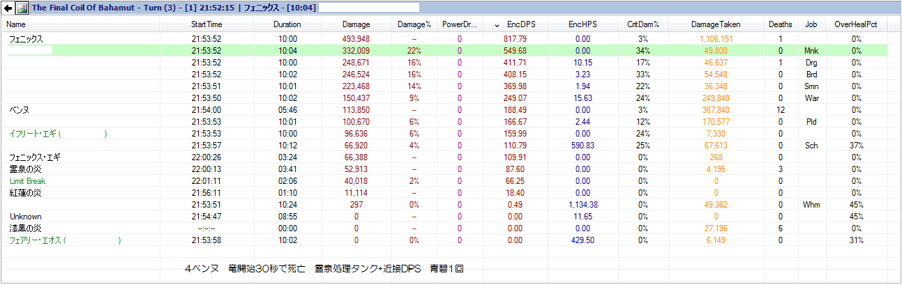 2014/01/28 Category : FF14(休) 真成 忍者効果絶大。青玉1回で指定位置は攻略初期位置なのでジャンプで距離稼ぐの必須。最終Pはナーブガスの発生まで方向が縛られるのがな…サンダー後方捨てなのも地味に面倒。最終Pは霊泉処理の関係で方向指定が若干取りにくい。TPがもつならもっと出るんだけど忍者なしだからね。四層は武器IL135召喚に勝つのは難しそう。ペイン没はダイブの少し後だが、回避方面の関係で攻撃できず。