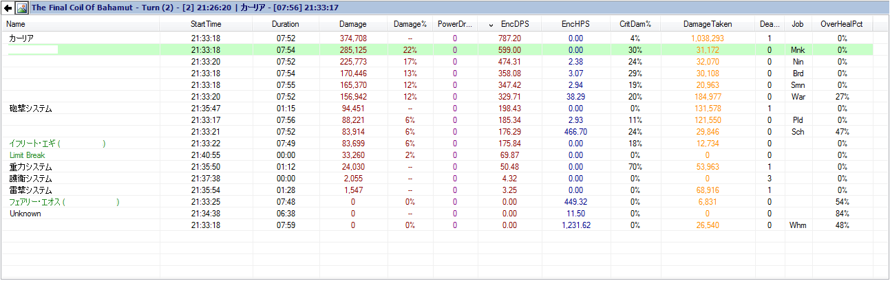 2014/03/09 Category : FF14(休) FF14 5層ようやくクリアできました。ようやくといっても、練習自体はたいした回数やってませんがね。火力の高い近接より、IL76詩人を出したほうが結果的にいい方向にいったわけですね。まさかいきなり詩人をだしてクリアできるとは思ってなかったけど。クリア経験者が複数いたのもよかったんでしょうね。戦闘時間は11分50秒で俺ともう一人の詩人が20万ほど削ってました。タイムアップは13分らしいので余裕はあったみたいです。2.2までにクリアできて本当によかった。肝心のドロップですが運がいいとこうなる。初クリアで俺のほしい武器が出る、ストレスがなく嬉しいかぎり。この後に極タイタンに1回手伝いでいってREPをとって見たら、ACTの結果では7分34秒で総ダメ135000、ジェイル2回でDPS297でした。ジェイル2回でもDPS300はいきたいところ。川ボムが一番楽な縦落ち西側3番目だったのでもう少し削らないとなんだけど、心核移行前のタイミングが無敵ジャンプ+ジェイルだったのでかなり微妙でしたね。LogRepとも見比べてみたけど、数百単位でダメが違うだけでほぼ同じでしたね。 PR