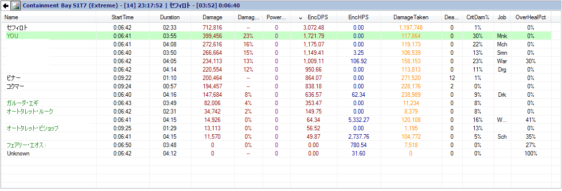 2016/03/12 Category : FF14(休) FF14 練習募集がなくなりかかってたけど間に合った。ループすらいってないけど面倒なのでループ経験者のクリア目的。調整は不要だったかもしれないけど攻撃を止めて雑魚で盛れなかったり、三連で1回迅雷切らしたり、忍者の人が常時三連の鉄槌で死んでたので(PS勢かもしれない)LB撃ったりしたけどまぁそこそこいけたかな。マントラは最初の頭割り直後、雑魚処理後半、風脈直前のふっとばし前でよさそう。雑魚前でDPS1615、巨大化前でDPS1600程度。武器はもう7週目の伝承武器でいいかなと思ってるので周回するか微妙。零式いかないならもはや俺の終着点はここだろうしやめ時ではあるんだけど・・・当分課金が切れないので伝承武器まで頑張るかなーとは思いますが。書いてたらモンクの空きがあったので格闘目的で参加しましたが倒すのが結構早い。銃がいれば210武器でもDPS1600はいきそうな気がする。LB2撃ってシェイカー1回でした。目当の格闘は出なかったけどもうほぼミスはしないかな。